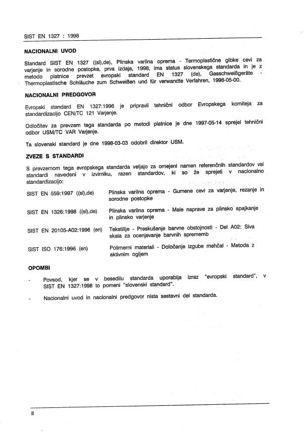 EN 1327:1996 is a standard + national annex and/or foreword published by the European Committee for Standardization (CEN). Its full title is "Gas welding equipment - Thermoplastic hoses for welding and allied processes". This standard covers: This European standard specifies the requirements and relevant methods of measurement and test two types of thermoplastic hoses with maximum design working pressure of 1 MPa and 2 MPa respectively, used for flexible gas supply lines in specific fields of application as follows: - small kits according to EN 1326; - air-aspirated blowpipes for welding and allied processes; - miniature welding such as jewellery work, dentistry work excluding acetylene applications; - arc welding with shielding gas.