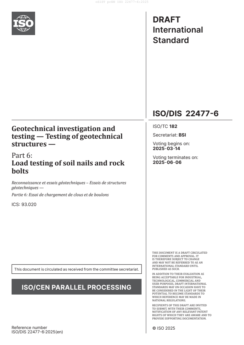 FprEN ISO 22477-6 is a draft published by the European Committee for Standardization (CEN). Its full title is "Geotechnical investigation and testing - Testing of geotechnical structures - Part 6: Load testing of soil nails and rock bolts (ISO/FDIS 22477‑6:2025)". This standard covers: This document establishes the specifications for the execution of static load tests on soil nails or rock bolts, in which a single element (soil nail or rock bolt) is subjected to an axial static load in tension in order to define its load-displacement behaviour. Load tests on rock bolts are also covered by this document