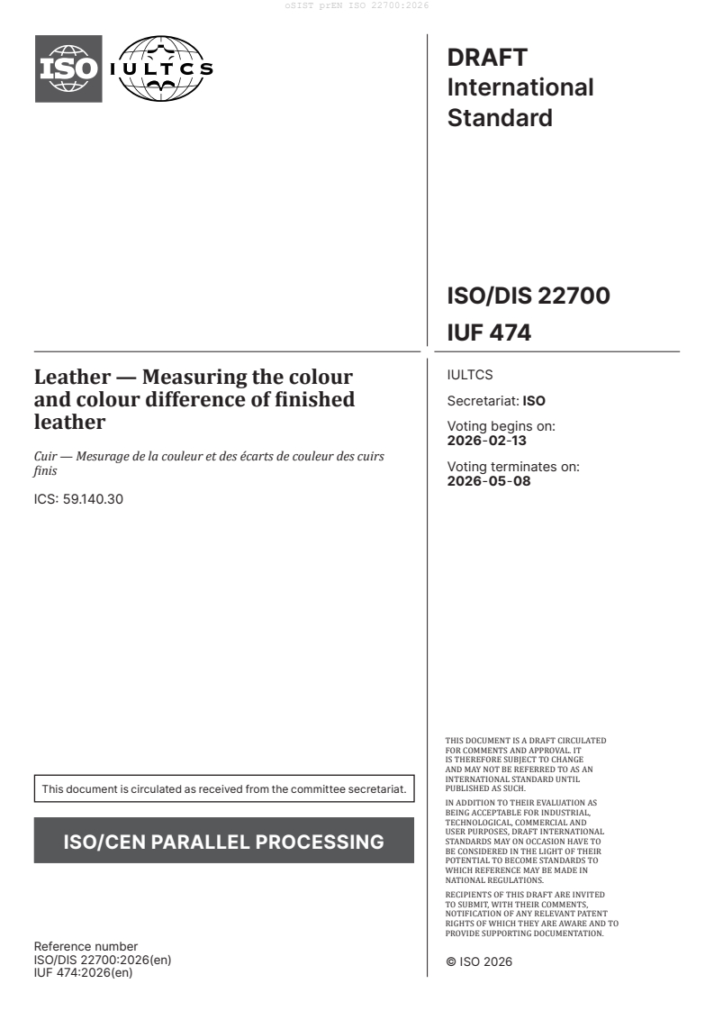 Leather - Measuring the colour and colour difference of finished leather (ISO/DIS 22700:2026)