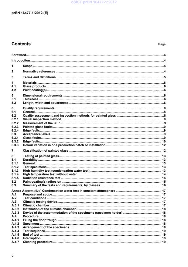prEN 16477-1 is a draft published by the European Committee for Standardization (CEN). Its full title is "Glass in building - Painted glass for internal use - Part 1: Requirements". This standard covers: This European Standard specifies minimum quality requirements (in respect of optical, visual and edge faults) and durability tests for painted glass for internal use in building.This standard applies only to painted glass manufactured from annealed soda lime silicate float glass or coated annealed soda lime silicate float glass (see EN 572-1, 572-2 and EN 1096-4). The painted glass may be translucent, transparent or opaque and supplied in stock/standard sizes and as-cut finished sizes. NOTE 1: Painted glass may be manufactured from other annealed glass or thermally treated glass. However the standard does not give information on minimum quality requirement for this substrate. The durability test methods are applicable. For painted glass used in aggressive and/or constantly high humidity atmospheres, e.g. horse riding halls, swimming pools, medical baths, saunas, etc. this standard is not applicable. NOTE 2: Bathrooms and kitchens are not considered as constantly high humidity atmospheres. This standard does not give requirements for framing, fixing or other support systems. NOTE 3: Useful advice on these items is contained in the informative annex C.