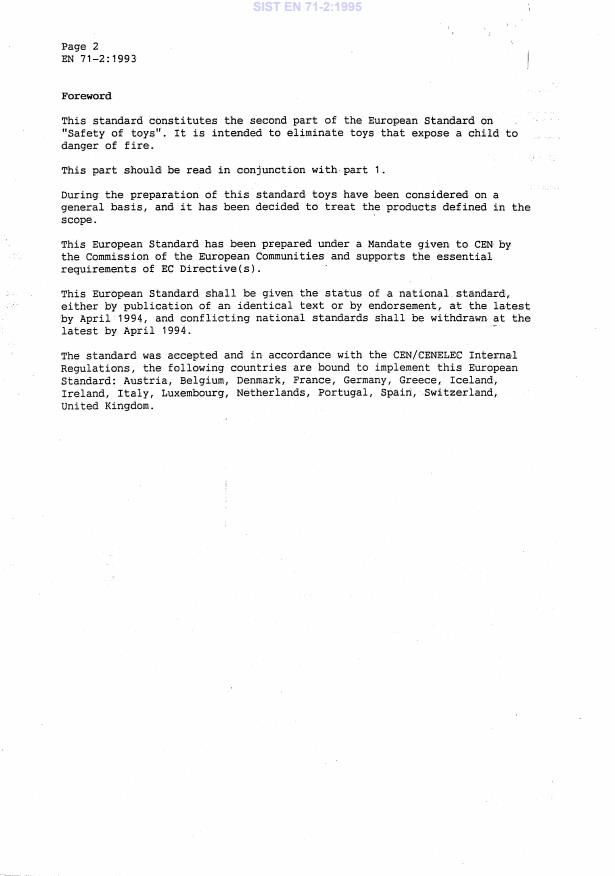 EN 71-2:1993/AC:1995 is a standard published by the European Committee for Standardization (CEN). Its full title is "Safety of toys - Part 2: Flammability". This standard covers: Safety of toys - Part 2: Flammability
