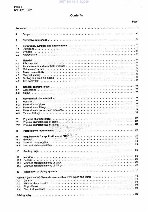 EN 1519-1:1999 is a standard published by the European Committee for Standardization (CEN). Its full title is "Plastics piping systems for soil and waste discharge (low and high temperature) within the building structure - Polyethylene (PE) - Part 1: Specifications for pipes, fittings and the system". This standard covers: This standard specifies the requirements for pipes, fittings and the system of polyethylene (PE) solid-wall piping systems in the field of soil and waste discharge - inside buildings (marked with "B") and - for both inside buildings and buried in ground within the building structure (marked with "BD"). It also specifies the test parameters for the test methods referred to in this standard.