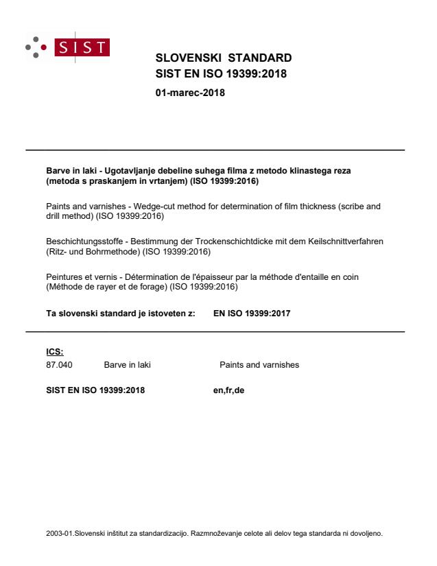 Barve in laki - Ugotavljanje debeline suhega filma z metodo klinastega reza (metoda s praskanjem in vrtanjem) (ISO 19399:2016)