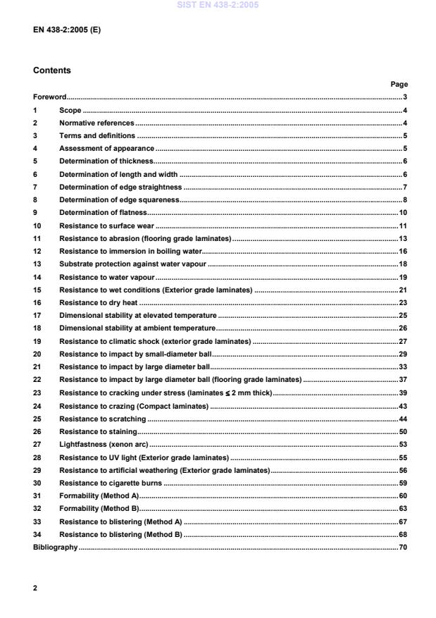 Page Foreword.3 1 Scope.4 2 Normative references.4 3 Terms and definitions.5 4 Assessment of appearance.5 5 Determination of thickness.6 6 Determination of length and width.6 7 Determination of edge straightness.7 8 Determination of edge squareness.8 9 Determination of flatness.10 10 Resistance to surface wear.11 11 Resistance to abrasion (flooring grade laminates).13 12 Resistance to immersion in boiling water.16 13 Substrate protection against water vapour.18 14 Resistance to water vapour.19 15 Resistance to wet conditions (Exterior grade laminates).21 16 Resistance to dry heat.23 17 Dimensional stability at elevated temperature.25 18 Dimensional stability at ambient temperature.26 19 Resistance to climatic shock (exterior grade laminates).27 20 Resistance to impact by small-diameter ball.29 21 Resistance to impact by large diameter ball.33 22 Resistance to impact by large diameter ball (flooring grade laminates).37 23 Resistance to cracking under stress (laminates ≤≤≤≤ 2 mm thick).39 24 Resistance to crazing (Compact laminates).43 25 Resistance to scratching.44 26 Resistance to staining.50 27 Lightfastness (xenon arc).53 28 Resistance to UV light (Exterior grade laminates).55 29 Resistance to artificial weathering (Exterior grade laminates).56 30 Resistance to cigarette burns.59 31 Formability (Method A).60 32 Formability (Method B).63 33 Resistance to blistering (Method A).67 34 Resistance to blistering (Method B).68 Bibliography.70