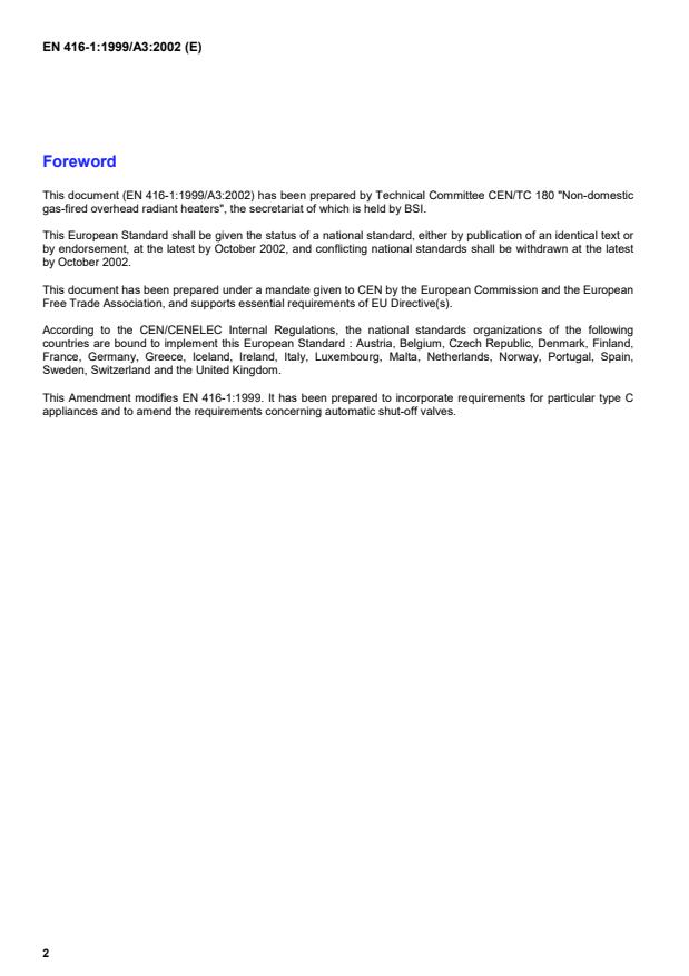 EN 416-1:1999/A3:2002 is a amendment published by the European Committee for Standardization (CEN). Its full title is "Single burner gas-fired overhead radiant tube heaters for non-domestic use - Part 1: Safety". This standard covers: This standard is applicable to type A2, A3, B12, B13, B22, B23, C12, C13, C32 and C33 appliances intended for use in other than domestic dwellings, in which the supply of combustion air and/or the evacuation of the products of combustion is achieved by mechanical means located upstream of the draught diverter, if provided.