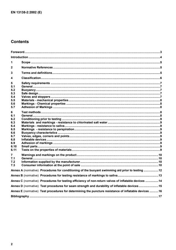 Fordated references, subsequent amendments to or revisions of any of these publications apply to this Europeanstandard only when incorporated in it by amendment or revision. For undated references, the latest edition of thepublication referred to applies (including amendments).EN 71-1:1998, Safety of toys - Part 1: Mechanical and physical properties.EN 71-3, Safety of toys - Part 3: Migration of certain elements.EN 393:1993, Lifejackets and personal buoyancy aids - Buoyancy aids 50 N.EN 20105-A02, Textiles - Tests for colour fastness - Part A02: Grey Scale for assessing change in colour (ISO 105-A02:1993).EN ISO 105-E03:1996, Textiles - Tests for colour fastness - Part E03: