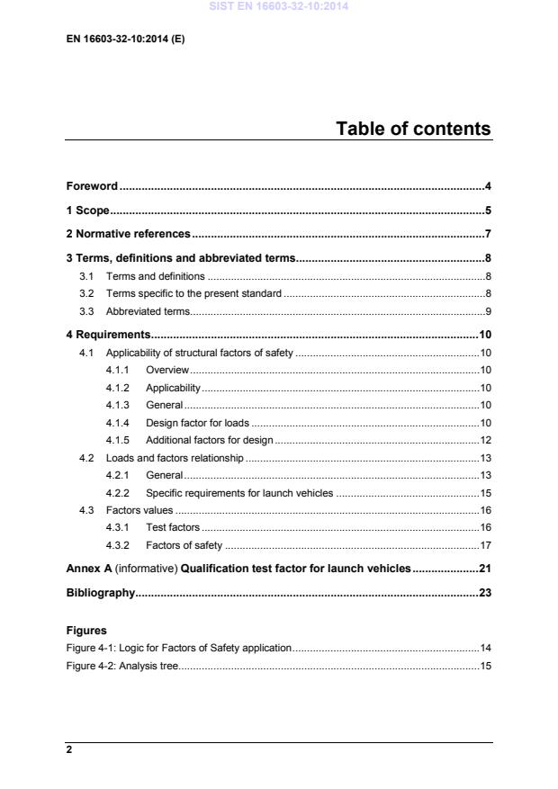 Foreword . 4 1 Scope . 5 2 Normative references . 7 3 Terms, definitions and abbreviated terms . 8 3.1 Terms and definitions . 8 3.2 Terms specific to the present standard . 8 3.3 Abbreviated terms. 9 4 Requirements . 10 4.1 Applicability of structural factors of safety . 10 4.1.1 Overview . 10 4.1.2 Applicability . 10 4.1.3 General . 10 4.1.4 Design factor for loads . 10 4.1.5 Additional factors for design . 12 4.2 Loads and factors relationship . 13 4.2.1 General . 13 4.2.2 Specific requirements for launch vehicles . 15 4.3 Factors values . 16 4.3.1 Test factors . 16 4.3.2 Factors of safety . 17 Annex A (informative) Qualification test factor for launch vehicles . 21 Bibliography . 23