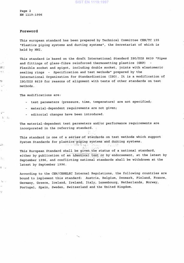 EN 1119:1996 is a standard published by the European Committee for Standardization (CEN). Its full title is "Plastics piping systems - Joints for glass-reinforced thermosetting plastics (GRP) pipes and fittings - Test methods for leaktightness and resistance to damage of flexible and reduced-articulation joints". This standard covers: This standard specifies test methods for flexible and reduced articulation spigot and socket joints, including double-socket joints, with elastomeric sealing elements for above ground and buried glass-reinforced thermosetting plastics (GRP) pipeline applications. It covers methods of test for the leaktightness and resistance to damage of the joint only, when subject to specified combinations of longitudinal extension (draw), angular movement (angular deflection), vertical compression (misalignment) and internal pressure.