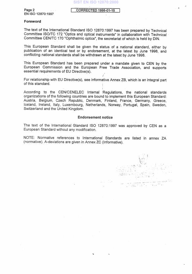 EN ISO 12870:1997 is a standard published by the European Committee for Standardization (CEN). Its full title is "Ophthalmic optics - Spectacle frames - General requirements and test methods (ISO 12870:1997)". This standard covers: This International Standard specifies general requirements for unglazed spectacle frames designed for use with all prescription lenses, including tinted and untinted lenses, and is applicable to frames at the point of sale to the retailer. It is applicable to all frame types, including rimless mounts, semi-rimless mounts, folding spectacle frames and spectacle frames made from natural organic materials (...). NOTE See annex A for recommandations on the design of spectacle frames. This Standard is not applicable to products designed specifically to provide personal eye protection.