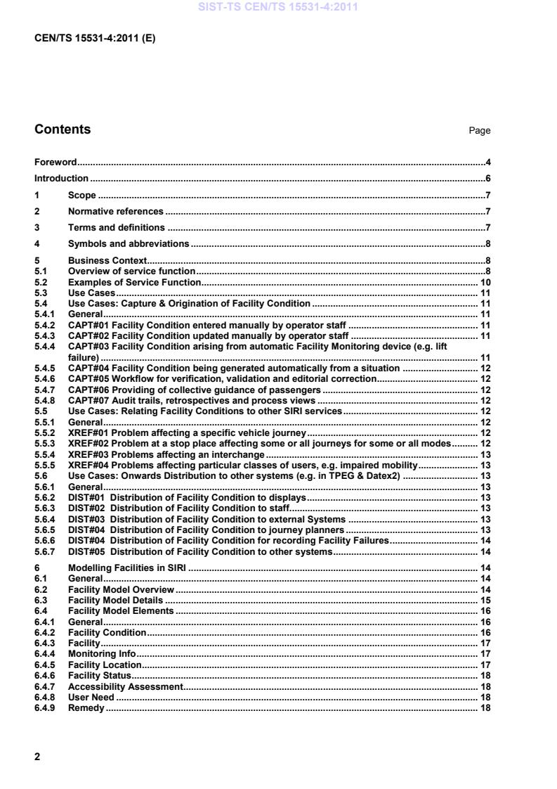 CEN/TS 15531-4:2011 is a technical specification published by the European Committee for Standardization (CEN). Its full title is "Public transport - Service interface for real-time information relating to public transport operations - Part 4: Functional service interfaces: Facility Monitoring". This standard covers: This Technical Specification specifies an additional SIRI functional service to exchange information about changes to availability of Public Transport facilities between monitoring systems and servers containing real-time public transport vehicle or journey time data. These include the control centres of transport operators, as well as information systems that deliver passenger travel information services.