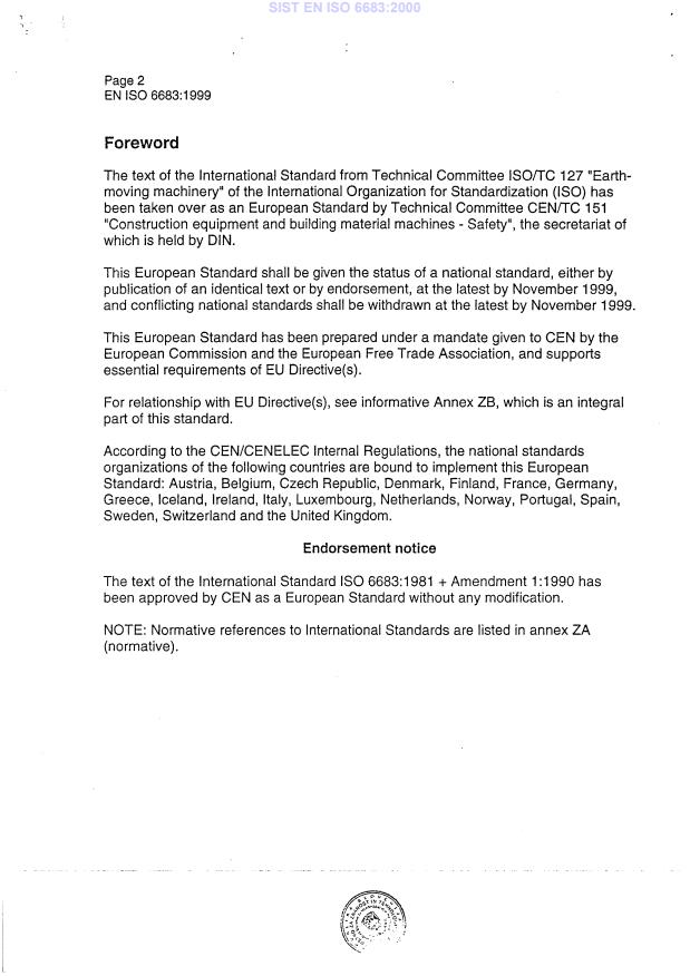 EN ISO 6683:1999 is a standard published by the European Committee for Standardization (CEN). Its full title is "Earth-moving machinery - Seat belts and seat belt anchorages (ISO 6683:1981 + Amendment 1:1990)". This standard covers: This International Sandard establishes the minimum performance requirements for seat belts and the fastening elements of seat belts necessary to restrain an operator or rider within a roll-over protective structure (ROPS) in the event of a machine roll-over as defined in ISO 3471. NOTE: Dynamic seat belt systems are under study. A suitable text will be added when available.