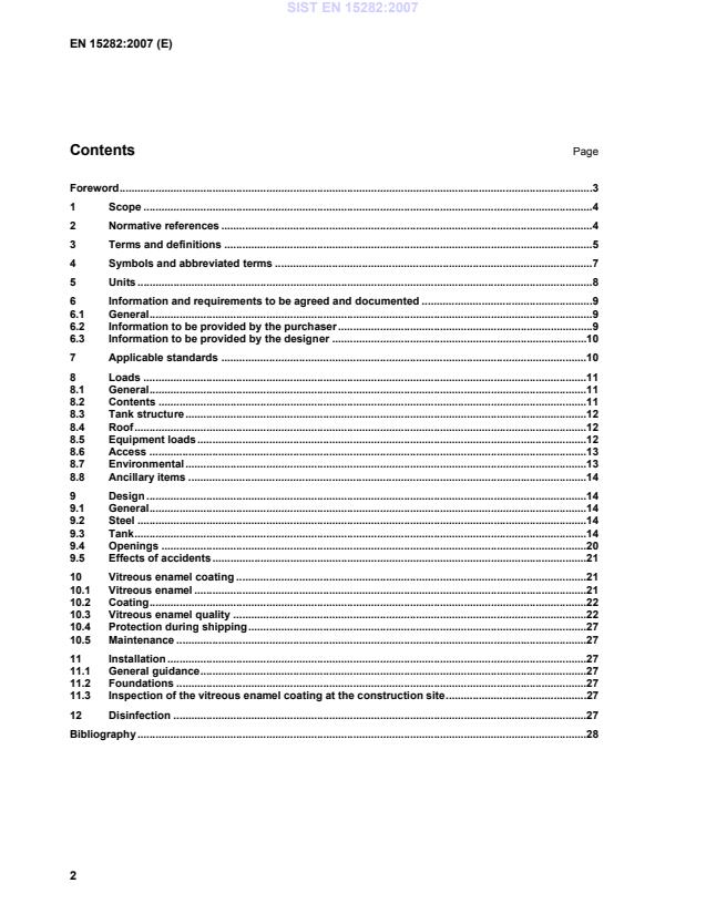 EN 15282:2007 is a standard published by the European Committee for Standardization (CEN). Its full title is "Vitreous and porcelain enamels - Design of bolted steel tanks for the storage or treatment of water or municipal or industrial effluents and sludges". This standard covers: This European Standard establishes the requirement for the design and use of vitreous enamel coated bolted cylindrical steel tanks for the storage or treatment of water or municipal or industrial effluents and sludges. This European Standard applies to the design of the tank and any associated roof and gives guidance on the requirements for the design of the foundation. This European Standard applies where: a) the tank is cylindrical and symmetrical on plan and is mounted on a load-bearing base substantially at or above ground level; b) the multiple of the tank diameter in meters and the wall height in meters has a value within the range 5 to 500; c) the tank diameter does not exceed 100 m, and the total wall height does not exceed 50 m; d) the stored material has the characteristics of a liquid exerting negligible friction force in the tank wall; the stored material may be undergoing treatment as part of a municipal or industrial effluent treatment process; e) the internal pressure above the liquid does not exceed 50 kPa and the internal partial vacuum above the liquid does not exceed 10 kPa; f) the walls of the tank are vertical; g) the floor of the tank is substantially flat at its intersection with the wall; the floor of the tank may have a rise or fall built in to allow complete emptying of the tank contents. The slope should not exceed 1:100; h) there is negligible inertial and impact load due to tank filling; i) the minimum thickness of the tank shell is 1,5 mm; j) the material used for the manufacture of the steel sheets is carbon steel; (tanks constructed of sheets made from aluminium or stainless steel are outside the scope of this European Standard), k) the temperature of the tank wall during operation is within the range - 50 °C to + 100 °C under all operating conditions. This European Standard also gives details of procedures to be followed during site installation and for inspection and maintenance of the installed tank. It does not appl
