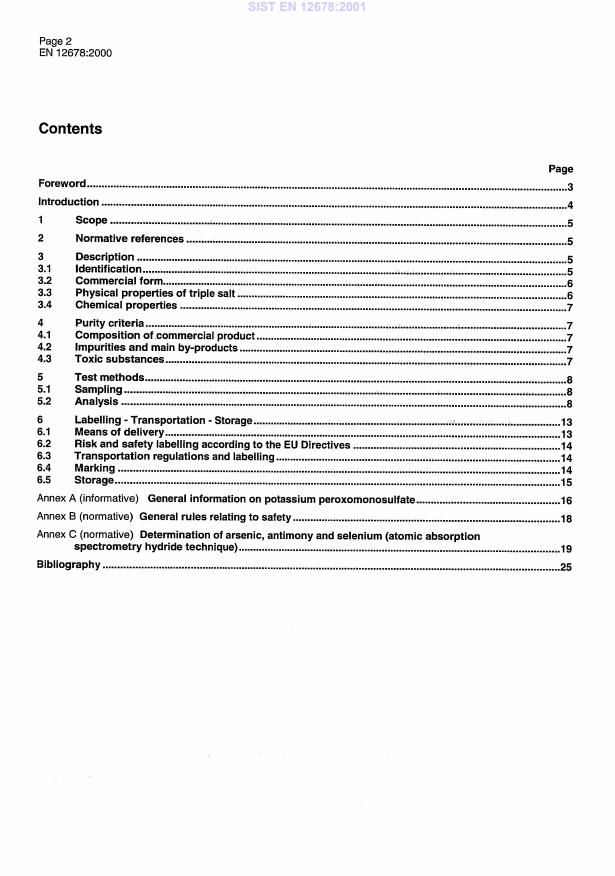EN 12678:2000 is a standard published by the European Committee for Standardization (CEN). Its full title is "Chemicals used for treatment of water intended for human consumption - Potassium peroxomonosulfate". This standard covers: This European Standard is applicable to potassium peroxomonosulfate used for treatment of water intended for human consumption. It describes the characteristics of potassium peroxomonosulfate and specifies the requirements and the corresponding test methods for potassium peroxomonosulfate. It gives information on its use in water treatment.