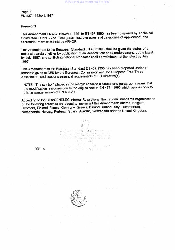 EN 437:1993/A1:1997 is a amendment published by the European Committee for Standardization (CEN). Its full title is "Test gases - Test pressures - Appliance categories". This standard covers: Migrated from Progress Sheet (TC Comment) (2000-07-10): see outcome of BT Resol 66/1995