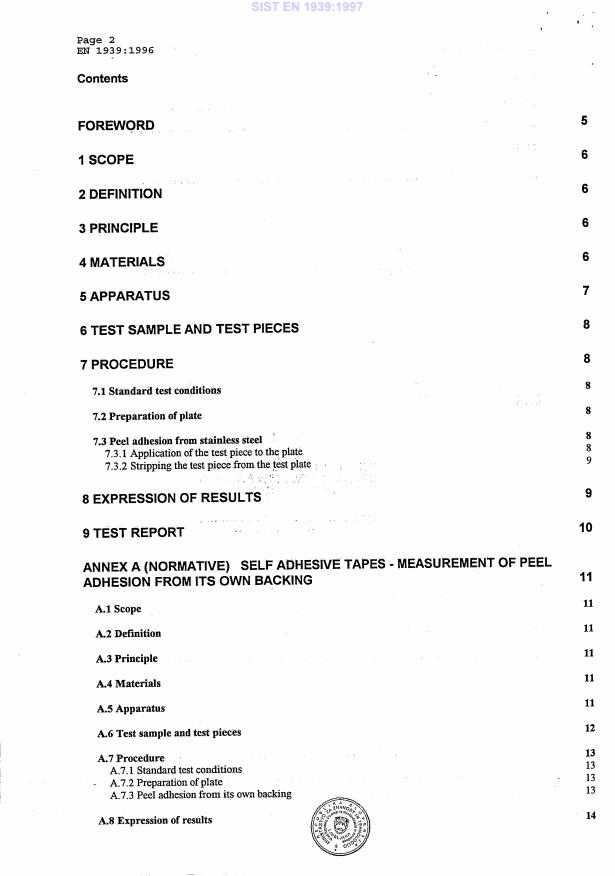 EN 1939:1996 is a standard published by the European Committee for Standardization (CEN). Its full title is "Self-adhesive tapes - Measurement of peel adhesion from stainless steel or from its own backing". This standard covers: This standard specifies the method to measure under specified test conditions the force required to remove an adhesive tape which has been applied to a standard metal surface. This European Standard specifies the method of measurement under specified test conditions, the force required to remove an adhesive tape...