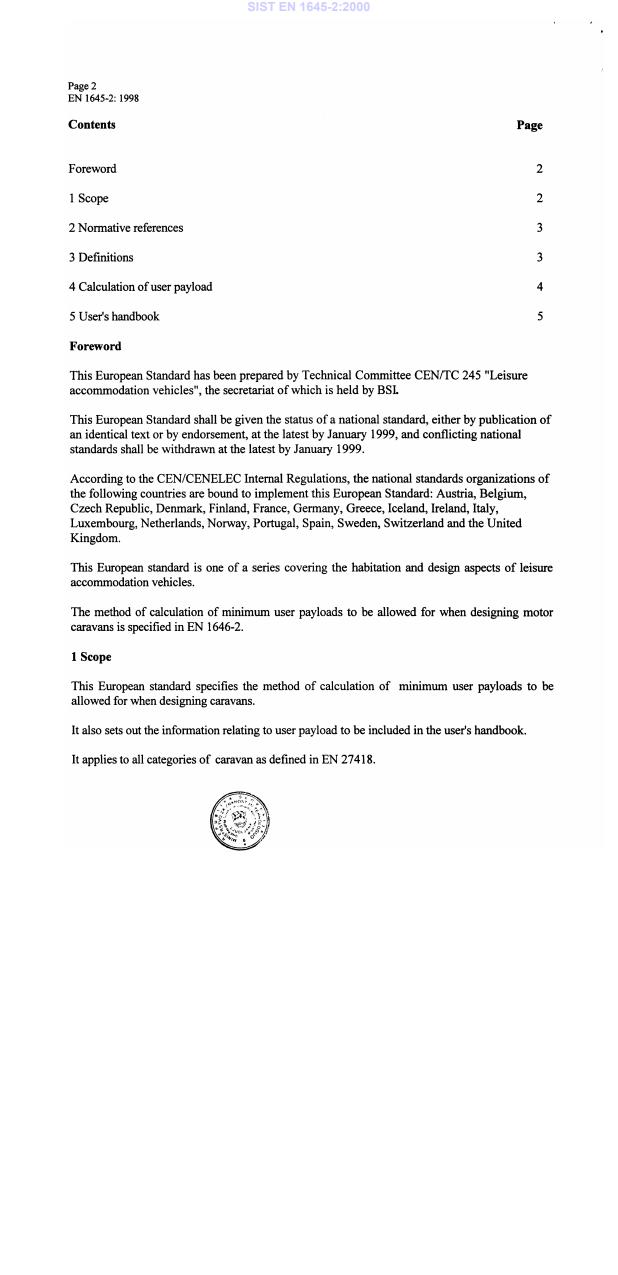 EN 1645-2:1998 is a standard published by the European Committee for Standardization (CEN). Its full title is "Leisure accommodation vehicles - Caravans - Part 2: User payload". This standard covers: This European standard specifies the method of calculation of minimum user payloads to be allowed for when designing caravans. It also sets out the information relating to user payload to be included in the user's handbook. It applies to all categories of caravan as defined in EN 27418.
