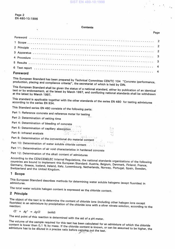 EN 480-10:1996 is a standard published by the European Committee for Standardization (CEN). Its full title is "Admixtures for concrete, mortar and grout - Test methods - Part 10: Determination of water soluble chloride content". This standard covers: This European Standard describes methods for determinating water soluble halogens (except fluorides) in admixtures. The total water soluble halogen content is expressed as the chloride content.