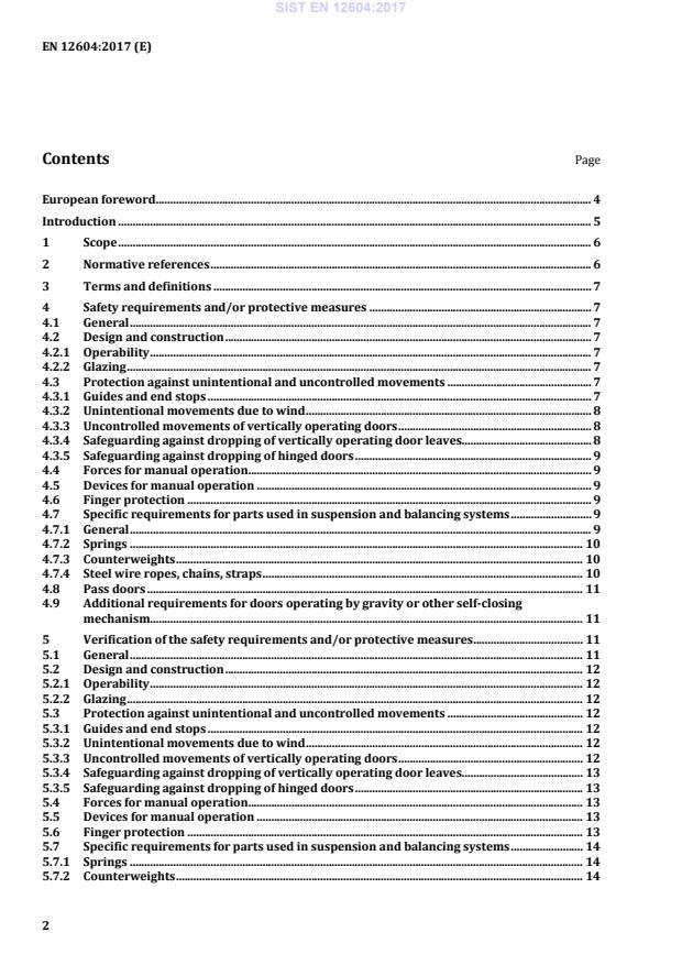 EN 12604:2017 is a standard published by the European Committee for Standardization (CEN). Its full title is "Industrial, commercial and garage doors and gates - Mechanical aspects - Requirements and test methods". This standard covers: This European Standard specifies mechanical requirements and test methods for manually operated doors, gates and barriers, intended for installation in areas in the reach of persons, and for which the main intended use is giving safe access for goods and vehicles accompanied or driven by persons in industrial, commercial or residential premises. This European Standard also covers manually operated vertically moving commercial doors such as rolling shutters and rolling grilles, used in retail premises which are mainly provided for goods protection. This document applies only to doors which are not part of the load carrying structure of the building. It does not apply to - lock gates and dock gates; - doors on vehicles; - doors mainly for the retention of animals unless they are at the site perimeter; - doors intended for pedestrian use; - railway barriers. Whenever the term "door" is used in this document, it is deemed to cover the full scope of types and variances of doors, gates and barriers defined by the scope of this Standard.