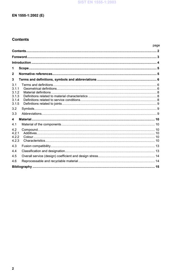EN 155-1:2002 (E)2ContentspageContents.2Foreword.3Introduction.41Scope.52Normative references.53Terms and definitions, symbols and abbreviations.63.1Terms and definitions.63.1.1Geometrical definitions.63.1.2Material definitions.83.1.3Definitions related to material characteristics.83.1.4Definitions related to service conditions.83.1.5Definitions related to joints.93.2Symbols.93.3Abbreviations.94Material.104.1Material of the components.104.2Compound.104.2.1Additives.104.2.2Colour.104.2.3Characteristics.104.3Fusion compatibility.134.4Classification and designation.134.5Overall service (design) coefficient and design stress.144.6Reprocessable and recyclable material.14Bibliography.15SIST EN 1555-1:2003