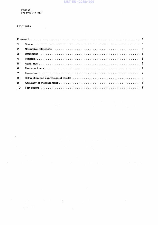 EN 12088:1997 is a standard published by the European Committee for Standardization (CEN). Its full title is "Thermal insulating products for building applications - Determination of long term water absorption by diffusion". This standard covers: This European Standard specifies equipment and procedures for determining the long term water absorption of test specimens by diffusion. It is applicable to thermal insulating products. It is intended to simulate the water absorption of products subjected to high relative humidities, approximating to 100%, on both sides and subjected to a water vapour pressure gradient for a long period of time e.g. inverted roof or unprotected ground insulation.