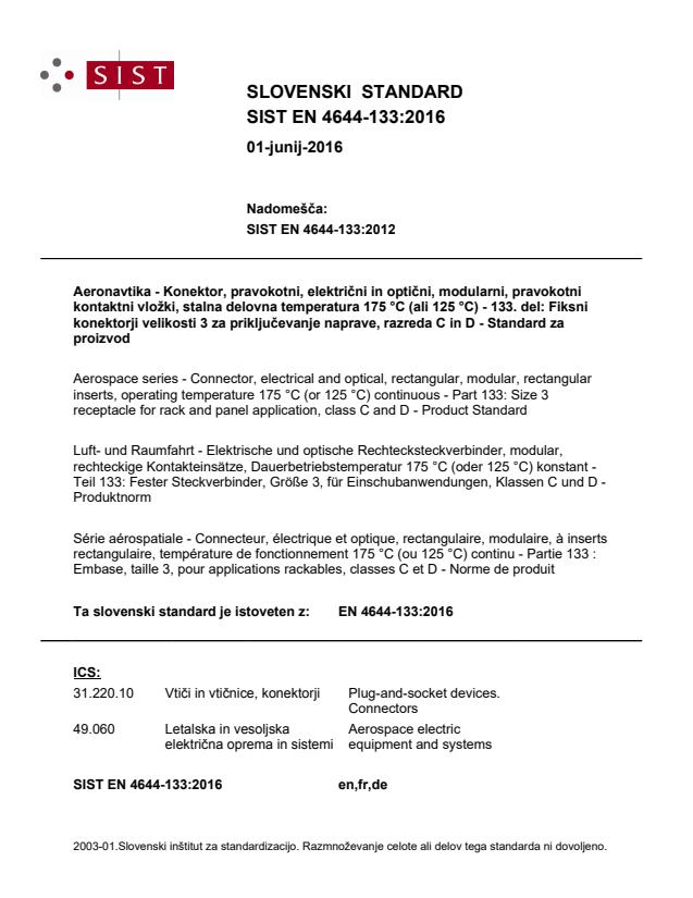 2003-01.Slovenski inštitut za standardizacijo. Razmnoževanje celote ali delov tega standarda ni dovoljeno.SURL]YRGLuft- und Raumfahrt - Elektrische und optische Rechtecksteckverbinder, modular, rechteckige Kontakteinsätze, Dauerbetriebstemperatur 175 °C (oder 125 °C) konstant - Teil 133: Fester Steckverbinder, Größe 3, für Einschubanwendungen, Klassen C und D - ProduktnormSérie aérospatiale - Connecteur, électrique et optique, rectangulaire, modulaire, à inserts rectangulaire, température de fonctionnement 175 °C (ou 125 °C) continu - Partie 133 : Embase, taille 3, pour applications rackables, classes C et D - Norme de produitAerospace series - Connector, electrical and optical, rectangular, modular, rectangular inserts, operating temperature 175 °C (or 125 °C) continuous - Part 133: Size 3 receptacle for rack and panel application, class C and D - Product Standard49.060Aerospace electric equipment and systems31.220.10Plug-and-socket devices. ConnectorsICS:Ta slovenski standard je istoveten z:EN 4644-133:2016SIST EN 4644-133:2016en,fr,de01-junij-2016SIST EN 4644-133:2016SLOVENSKI