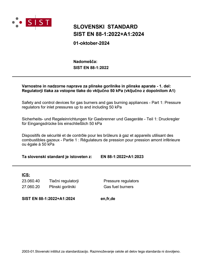 EN 88-1:2022+A1:2023 is the CEN European standard for safety and control devices for gas burners and gas burning appliances, specifically covering pressure regulators for inlet pressures up to and including 50 kPa. The standard defines classification, design, testing and performance requirements and includes Amendment A1 (2023). It applies to the design, verification and documentation of pressure regulators used with low‑pressure gas supplies.