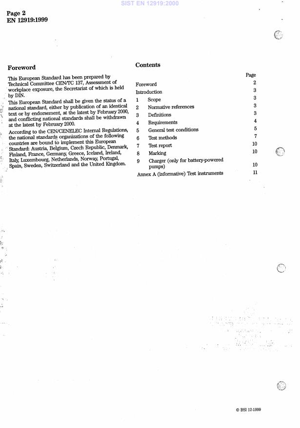 EN 12919:1999 is a standard published by the European Committee for Standardization (CEN). Its full title is "Workplace atmospheres - Pumps for the sampling of chemical agents with a volume flow rate of over 5 l/min - Requirements and test methods". This standard covers: This European Standard specifies the performance requirements for pumps used within the scope of measuring methods for the determination of the concentration of chemical agents in the workplace atmosphere. The pumps considered in this standard are mainly used for aerosol sampling. The standard is valid for pumps with a nominal volumetric flow rate within the range 5 l/min to 400 l/min.