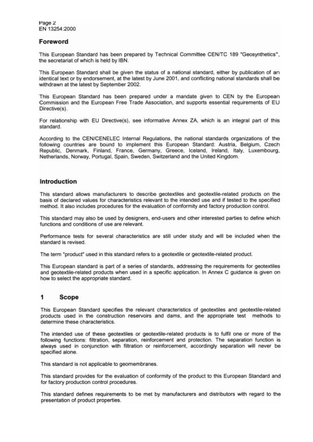 EN 13254:2000 is a standard published by the European Committee for Standardization (CEN). Its full title is "Geotextiles and geotextile-related products - Characteristics required for use in the construction of reservoirs and dams". This standard covers: This European Standard specifies the relevant characteristics of geotextiles and geotextile-related products used in the construction reservoirs and dams, and the appropriate test methods to determine these characteristics. The intended use of these geotextiles or geotextile-related products is to fulfil one or more of the following functions: filtration, separation, reinforcement and protection. The separation function is always used in conjunction with filtration or reinforcement, accordingly separation will never be specified alone. This standard is not applicable to geomembranes. This standard provides for the evaluation of conformity of the product to this European Standard and for factory production control procedures. This standard defines requirements to be met by manufacturers and distributors with regard to the presentation of product properties.NOTE 1 Particular application cases or national specifications may contain requirements regarding additional properties and - preferably standardised - test methods, if they are technically relevant and not conflicting with European Standards. NOTE 2 This European Standard may be used to derive design values by taking into account factors within the context of the definitions given in Eurocode 7 (ENV 1997-1), e.g. factors of safety. The design life of the product should be determined, since its function may be temporary, as a construction expediency, or permanent, for the lifetime of the structure.