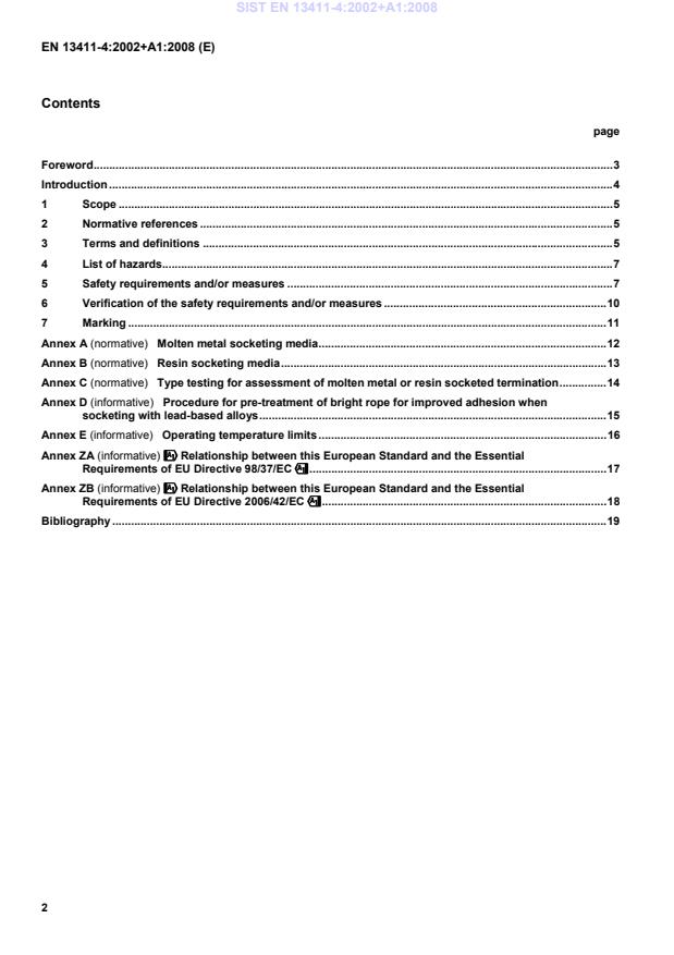 Foreword This document (EN 13411-4:2002+A1:2008) has been prepared by Technical Committee CEN /TC 168 "Chains, ropes, webbing, slings and accessories - Safety", the secretariat of which is held by BSI. This European Standard shall be given the status of a national standard, either by publication of an identical text or by endorsement, at the latest by April 2009, and conflicting national standards shall be withdrawn at the latest by December 2009. This document supersedes EN 13411-4:2002. This document includes Amendment 1, approved by CEN on 2008-09-18. The start and finish of text introduced or altered by amendment is indicated in the text by tags !". This document has been prepared under a mandate given to CEN by the European Commission and the European Free Trade Association, and supports essential requirements of EU Directive(s). !For relationship with EU Directive(s), see informative Annexes ZA and ZB, which are integral parts of this document." The other Parts of this European Standard are: Part 1: General purpose steel thimbles Part 2: Spliced eyes Part 3: Ferrule secured eyes Part 5: U-bolt wire rope gripped terminations Part 6: Asymmetric wedge socket clevis Part 7: Symmetric wedge socket clevis The annexes A, B, and C are normative. !The Annexes D, E, ZA and ZB are informative." According to the CEN/CENELEC Internal Regulations, the national standards organizations of the following countries are bound to implement this European Standard: Austria, Belgium, Bulgaria, Cyprus, Czech Republic, Denmark, Estonia, Finland, France, Germany, Greece, Hungary, Iceland, Ireland, Italy, Latvia, Lithuania, Luxembourg, Malta, Netherlands, Norway, Poland, Portugal, Romania, Slovakia, Slovenia, Spain, Sweden, Switzerland and United Kingdom. SIST EN 13411-4:2002+A1:2008