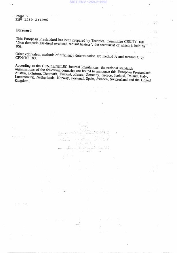 ENV 1259-2:1996 is a standardization document published by the European Committee for Standardization (CEN). Its full title is "Single burner gas-fired overhead radiant tube heaters and non-domestic gas-fired overhead luminous radiant heaters - Part 2: Requirements and test methods for establishing the rational use of energy - Radiometric method B". This standard covers: This ENV contains the requirements and test method B for the rational energy saving of radiant heaters and plaque heaters for commercial and industrial application described in the following text as "heaters" with a defined radiant reference level, defined in paragraph 3.