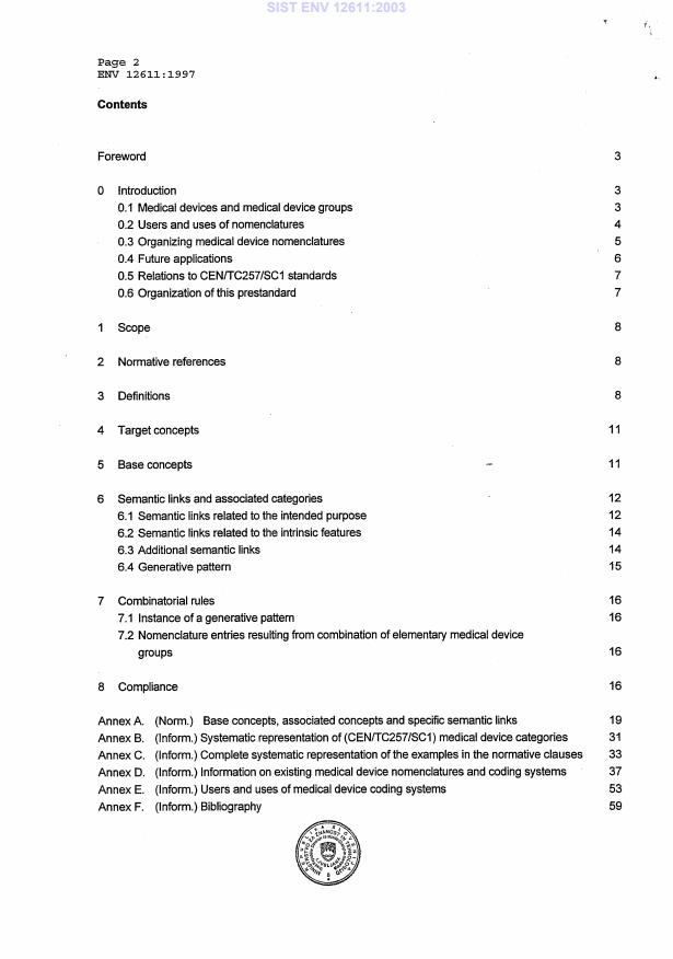 ENV 12611:1997 is a standardization document published by the European Committee for Standardization (CEN). Its full title is "Medical informatics - Categorial structure of systems of concepts - Medical devices". This standard covers: This European Prestandard specifies the necessary requirements (clauses 5, 6 and 7) for the categorial structure of systems of concepts for medical device groups (clause 4). This prestandard is meant to be used by organizations involved with the development or maintenance of nomenclatures and coding systems for medical devices, and by designers of databases or information systems involving medical devices.
