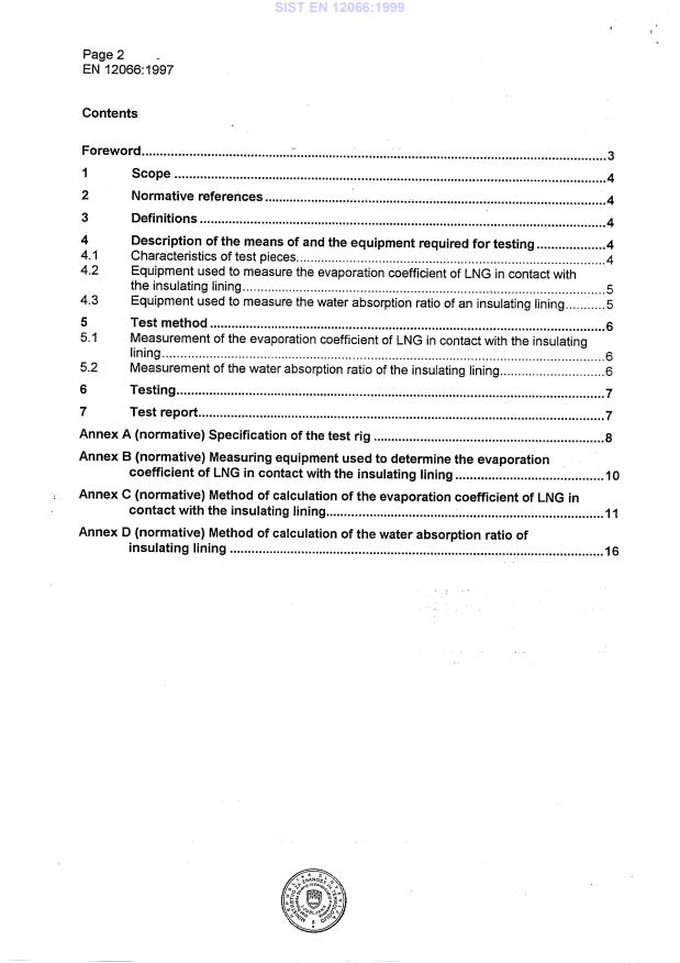 EN 12066:1997 is a standard published by the European Committee for Standardization (CEN). Its full title is "Installations and equipment for liquefied natural gas - Testing of insulating linings for liquefied natural gas impounding areas". This standard covers: This European Standard specifies the tests to be carried out in order to assess the suitability of insulating linings used in LNG impounding areas.