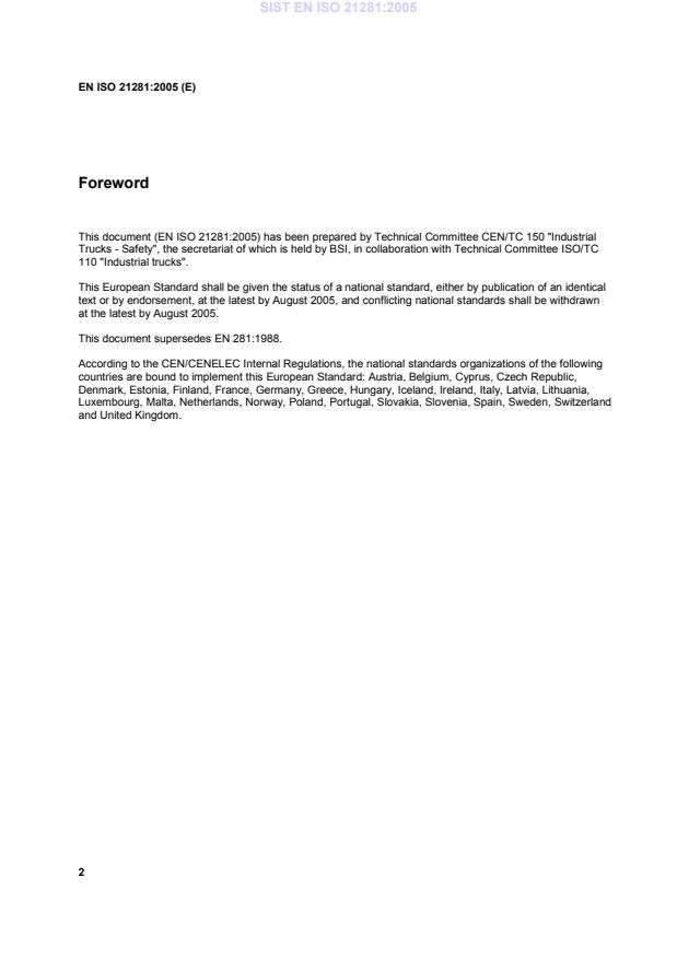 EN ISO 21281:2005 is a standard published by the European Committee for Standardization (CEN). Its full title is "Construction and layout of pedals of self-propelled sit-down rider-controlled industrial trucks - Rules for the construction and layout of pedals (ISO 21281:2005)". This standard covers: ISO 21281:2005 specifies the layout of pedals of self propelled sit-down rider-controlled industrial trucks, as defined in Parts 1, 2, 3 and 6 of ISO 3691.