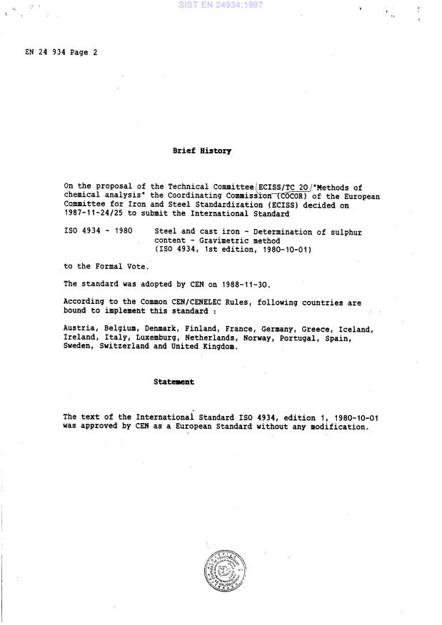 Steel and cast iron - Determination of sulphur content - Gravimetric method (ISO 4934:1980, ed. 1)