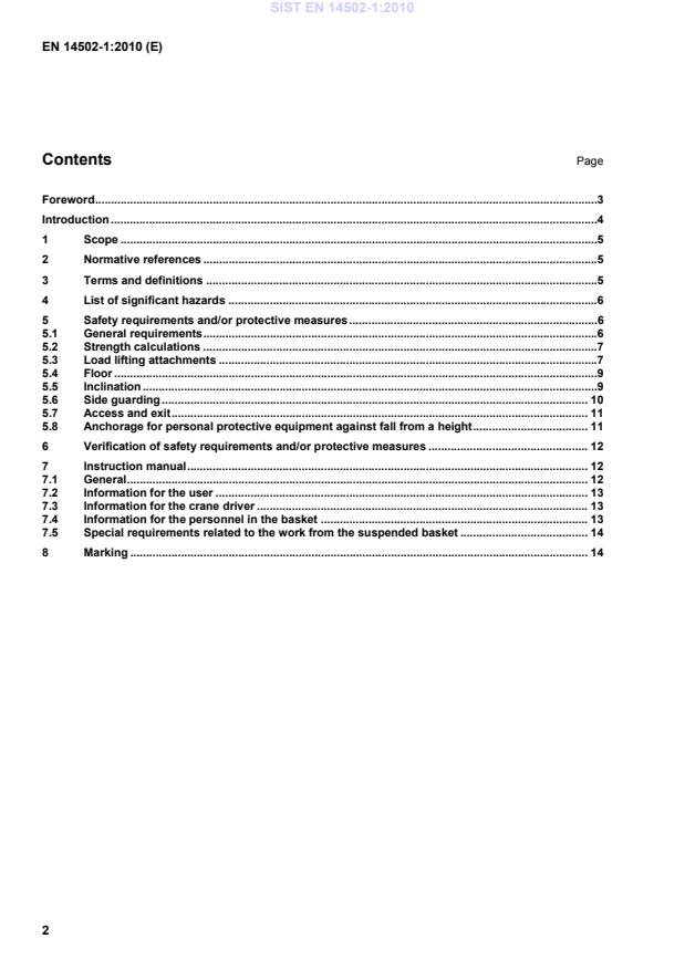 1 Scope This European Standard applies to baskets suspended on cranes. This European Standard does not cover the controls for the movement of the basket. This European Standard is not applicable to: lifts for crane drivers; moveable cabins. This European Standard deals with all significant hazards, hazardous situations and events relevant to suspended baskets, when used as intended and under conditions foreseen by the manufacturer (see Clause 4). The significant hazards covered by this document are identified in Clause 4. This European Standard is not applicable to suspended baskets which are manufactured before the date of publication by CEN. 2 Normative references The following referenced documents are indispensable for the application of this document. For dated references, only the edition cited applies. For undated references, the latest edition of the referenced document (including any amendments) applies. EN 795, Protection against falls from a height — Anchor devices — Requirements and testing EN 818-4, Short link chain for lifting purposes — Safety — Part 4: Chain slings — Grade 8 EN 13411-1, Terminations for steel wire ropes — Safety — Part 1: Thimbles for steel wire rope slings EN 13411-2, Terminations for steel wire ropes — Safety — Part 2: Splicing of eyes for wire rope slings EN 13411-3, Terminations for steel wire ropes — Safety — Part 3: Ferrules and ferrule-securing EN 13414-1, Steel wire rope slings — Safety — Part 1: Slings for general lifting service EN 13586:2004+ A1:2008, Cranes — Access 3 Terms and definitions For the purposes of this document, the following terms and definitions apply. 3.1 suspended basket arrangement designed for the lifting of persons by a crane SIST EN 14502-1:2010