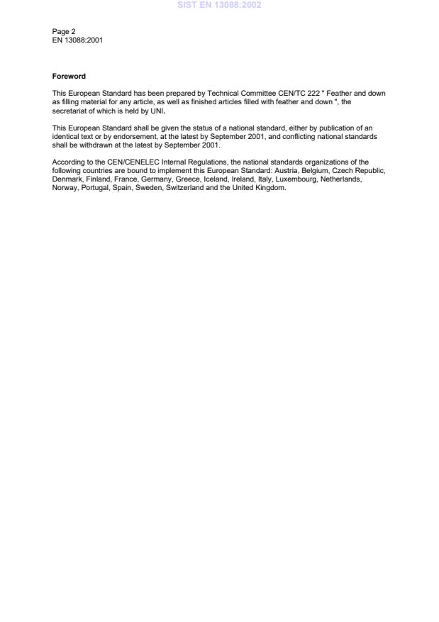 Page 2EN 13088:2001ForewordThis European Standard has been prepared by Technical Committee CEN/TC 222 " Feather and downas filling material for any article, as well as finished articles filled with feather and down ", thesecretariat of which is held by UNI.This European Standard shall be given the status of a national standard, either by publication of anidentical text or by endorsement, at the latest by September 2001, and conflicting national standardsshall be withdrawn at the latest by September 2001.According to the CEN/CENELEC Internal Regulations, the national standards organizations of thefollowing countries are bound to implement this European Standard: Austria, Belgium, Czech Republic,Denmark, Finland, France, Germany, Greece, Iceland, Ireland, Italy, Luxembourg, Netherlands,Norway, Portugal, Spain, Sweden, Switzerland and the United Kingdom.SIST EN 13088:2002