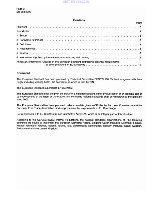 EN 358:1999 is a standard published by the European Committee for Standardization (CEN). Its full title is "Personal protective equipment for work positioning and prevention of falls from a height - Belts for work positioning and restraint and work positioning lanyards". This standard covers: This European Standard applies to belts and lanyards intended for the purpose ofwork positioning or restraint. It specifies the requirements, testing, marking and information supplied bu-y the manufacturer.