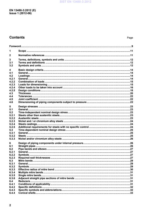 Issue 1 (2012-06) 4 9.2.1 Symbols .93 9.2.2 Elastic stress limits .94 9.3 Cylindrical pipes, elbows and mitre bends .94 9.3.1 Determination of lengths .94 9.3.2 Interstiffener collapse .96 9.3.3 Overall collapse of stiffened pipes .98 9.3.4 Stiffener stability .99 9.3.5 Heating/cooling channels . 102 9.4 Reducers (conical shells) . 103 9.5 Dished ends . 104 9.5.1 Hemispherical ends . 104 9.5.2 Torispherical ends . 105 9.5.3 Ellipsoidal ends . 105 10 Design for cyclic loading . 106 10.1 General . 106 10.2 Exemption from detailed fatigue analysis . 106 10.3 Fatigue design for cyclic pressure . 107 10.3.1 Equivalent full load cycles . 107 10.3.2 Simplified fatigue analysis . 107 10.4 Fatigue design for thermal gradients . 121 10.4.1 General . 121 10.4.2 Design guidance . 121 10.5 Fatigue design for combined loads . 121 11 Integral attachments . 122 11.1 General . 122 11.2 Allowable stresses. 122 11.3 Symbols . 123 11.4 Hollow circular attachments . 125 11.4.1 Limitations . 125 11.4.2 Preliminary calculations . 125 11.4.3 Analysis of attachments welded to pipe with a full penetration weld . 127 11.4.4 Analysis of attachments welded to pipe with fillet or partial penetration weld . 128 11.5 Rectangular attachments . 128 11.5.1 Limitations . 128 11.5.2 Preliminary calculations . 128 11.5.3 Analysis of attachments welded to pipe with a full penetration weld . 130 11.5.4 Analysis of attachments welded to pipe with fillet or partial penetration weld . 130 11.6 Stress analysis of the run pipe . 131 11.7 Shear stress analysis in attachment. 132 11.7.1 Hollow circular attachments . 132 11.7.2 Rectangular attachments . 133 11.8 Alternative calculation methods . 133 12 Flexibility analysis and acceptance criteria . 133 12.1 Basic conditions . 133 12.1.1 General . 133 12.1.2 Loading conditions . 133 12.1.3 Allowable stresses. 133 12.2 Piping flexibility . 135 12.2.1 General . 135 12.2.2 Basic conditions . 135 12.2.3 Displacement strains . 136 12.2.4 Displacement stresses . 137 12.2.5 Stress range . 137 12.2.6 Cold pull . 138 12.2.7 Properties for flexibility analysis . 138 12.2.8 Supporting conditions . 139 12.2.9 Expansion joints . 140 SIST EN 13480-3:2012