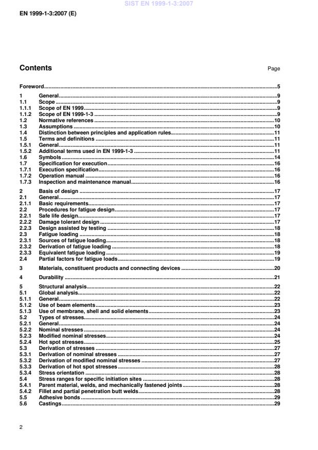 10 (3) EN 1999-1-3 is intended to be used in conjunction with EN 1090-3 “Technical requirements for the execution of aluminium structures” which contains the requirements necessary for the design assumptions to be met during execution of components and structures. (4) EN 1999-1-3 does not cover pressurised containment vessels or pipe-work. (5) The following subjects are dealt with in EN 1999-1-3: Section 1: General Section 2: Basis of design Section 3: Materials, constituent products and connecting devices Section 4: Durability Section 5: Structural analysis Section 6: Ultimate limit state of fatigue Annex A: Basis for calculation of fatigue resistance [normative] Annex B: Guidance on assessment by fracture mechanics [informative] Annex C: Testing for fatigue design [informative] Annex D: Stress analysis [informative] Annex E: Adhesively bonded joints [informative] Annex F: Low cycle fatigue range [informative] Annex G: Influence of R-ratio [informative] Annex H: Fatigue strength improvement of welds [informative] Annex I: Castings [informative] Annex J: Detail category tables [informative] Annex K: Hot spot reference detail method [informative] Bibliography 1.2 Normative references (1) The normative references of EN 1999-1-1 apply. 1.3 Assumptions (1) P The general assumptions of EN 1990, 1.3 apply. (2) P The provisions of EN 1999-1-1, 1.8 apply. (3) P The design procedures are valid only when the requirements for execution in EN 1090-3 or other equivalent requirements are complied with. SIST EN 1999-1-3:2007
