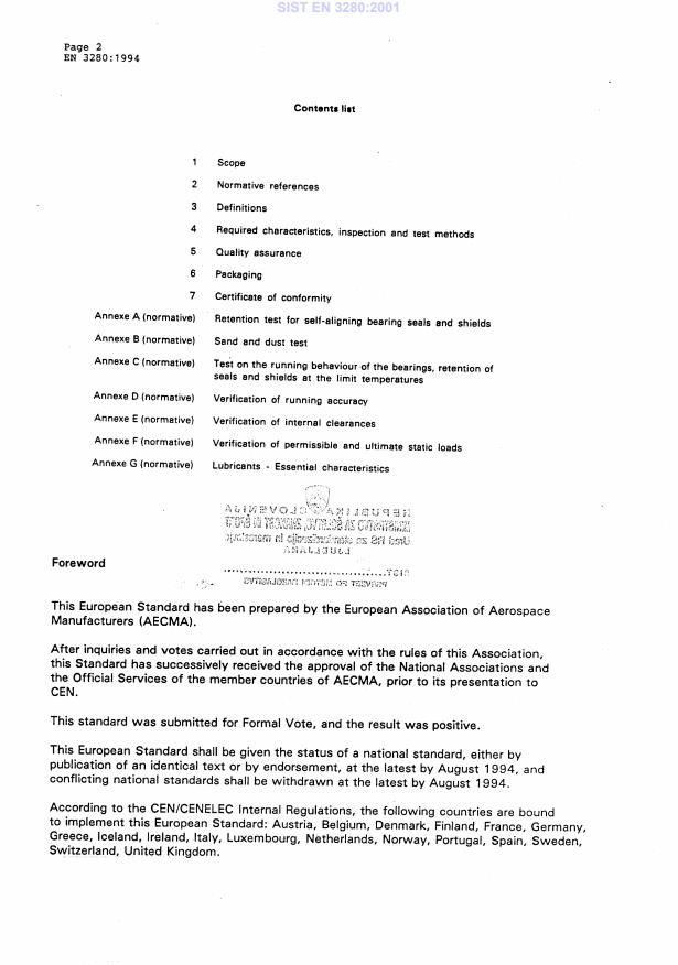 EN 3280:1994 is a standard published by the European Committee for Standardization (CEN). Its full title is "Aerospace series - Bearings, airframe rolling, rigid or self-aligning - Technical specification". This standard covers: This standard specifies the required characteristics, inspection and test methods, qualification and acceptance conditions for tigid or self-aligning airframe rolling bearings.