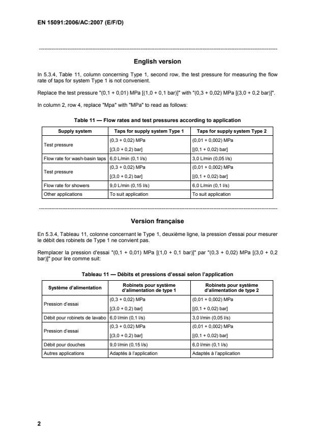 EN 15091:2006/AC:2007 is a corrigendum published by the European Committee for Standardization (CEN). Its full title is "Sanitary tapware - Electronic opening and closing sanitary tapware". This standard covers: TC - Table 11, 2nd column, 2nd row - Correction of test pressure