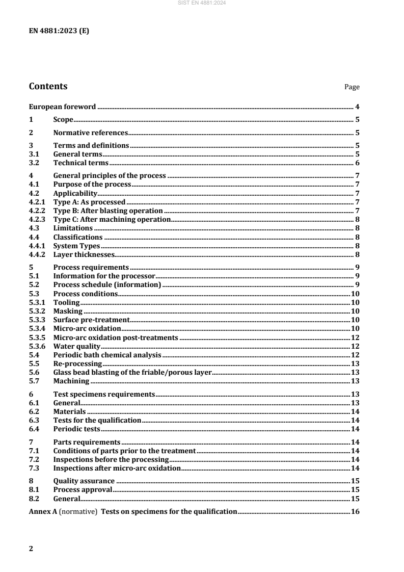 Normative references cited in EN 4881:2023 include EN ISO 2409 (cross‑cut test), EN ISO 4516 (microhardness), EN ISO 9227 (salt spray), EN 6072 (fatigue testing) and ASTM D4060 (Taber abrasion). For detailed implementation and numerical process parameters consult the full EN 4881:2023 text.