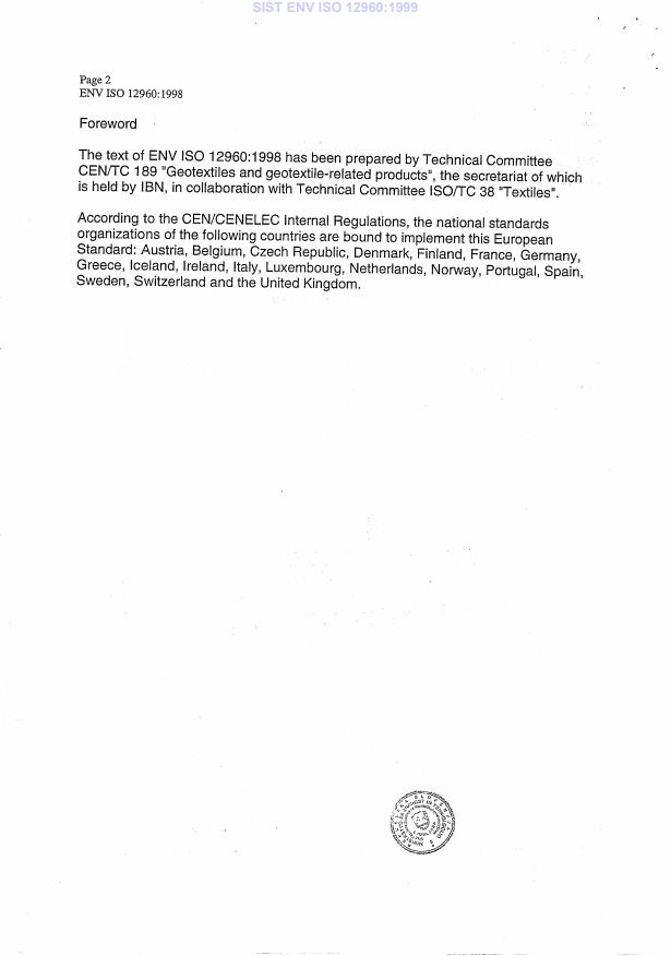 ENV ISO 12960:1998 is a standard published by the European Committee for Standardization (CEN). Its full title is "Geotextiles and geotextile-related products - Screening test method for determining the resistance to liquids (ISO/TR 12960:1998)". This standard covers: This standard specifies methods for screening the resistance of geotextile products to liquids while not subjecting them to external mechanical stress. The standard is applicable to all geotextiles and geotextile related products. Note: This standard only considers conditions where the specimens are fully immersed in the liquids. Though outside the scope of this standard, the test conditions may be modified to accommodate particular applications, eg gaseous media.