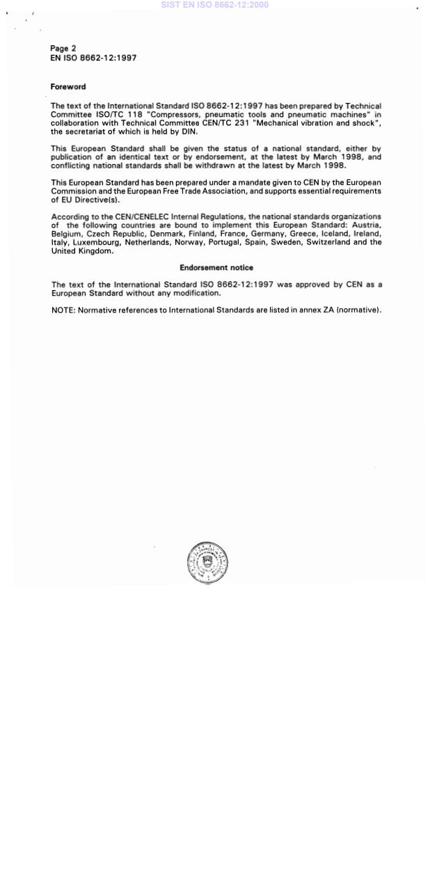EN ISO 8662-12:1997 is associated with the following European legislation: EU Directives/Regulations: 89/392/EEC, 98/37/EC; Standardization Mandates: M/079. When a standard is cited in the Official Journal of the European Union, products manufactured in conformity with it benefit from a presumption of conformity with the essential requirements of the corresponding EU directive or regulation.