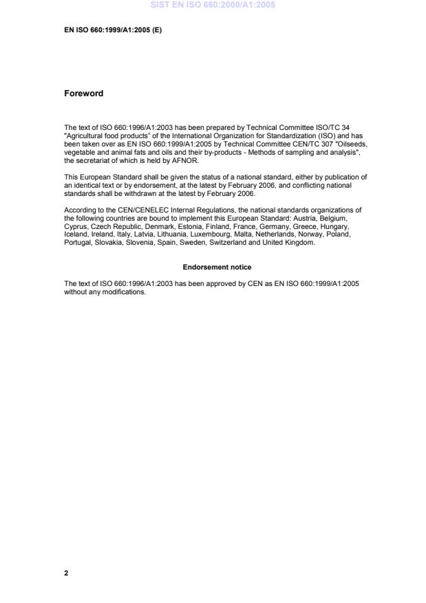 This amendment A1 modifies the European Standard EN ISO 660:1999; it was approved by CEN on 28 July 2005.