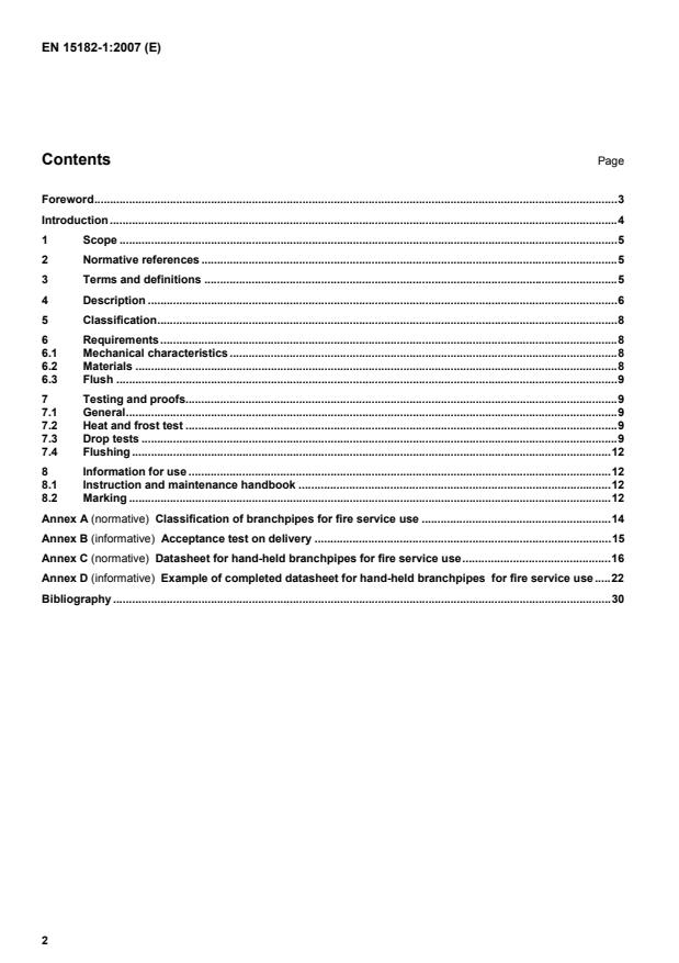 1 Scope This part of this European Standard applies to hand-held branchpipes. It deals with: safety requirements; performance requirements; test methods; classification and designation; instructions for use and maintenance; marking. This standard should be read in conjunction with parts 2, 3 or 4. This standard does not apply to branchpipes covered by EN 671, foam branchpipes, powder branchpipes, or branchpipes with a maximum working pressure above 40 bar. NOTE 1 The Working Group has thoroughly addressed and discussed the issue of electrical safety in relation to using water branchpipes. However, an electrical test is not incorporated into this standard as international experience, as well as research (NFPA handbook, French research, etc) have shown that any "artificial" or "laboratory style" testing will not take into account poor visibility and other conditions present on any fireground, nor the problem of estimating distances under these conditions. The end user should be advised (through the operating instructions, see 8.1) that when fighting fires in or near electrical installations, the power should be cut off as soon as possible. Also, maintain a maximum possible safety distance (at least 1 m up to 1 000 V) and use a spray jet with a minimum spray angle of 30 °. NOTE 2 Reaction forces should be taken into consideration before choosing and operating branchpipes. 2 Normative references The following referenced documents are indispensable for the application of this document. For dated references, only the edition cited applies. For undated references, the latest edition of the referenced document (including any amendments) applies. EN 15182-2, Hand-held branchpipes for fire service use – Part 2: Combination branchpipes PN 16 EN 15182-3, Hand-held branchpipes for fire service use – Part 3: Smooth bore jet and/or one fixed spray jet angle branchpipes PN 16 EN 15182-4, Hand-held branchpipes for fire service use – Part 4: High pressure branchpipes PN 40 3 Terms and definitions For the purposes of this document, the following terms and definitions apply. 3.1 branchpipe combination of components that connects to a water supply via a hose and coupling and projects water according to the operators requirements 3.2 nozzle component of a branchpipe that controls the water flow rate and/or pattern