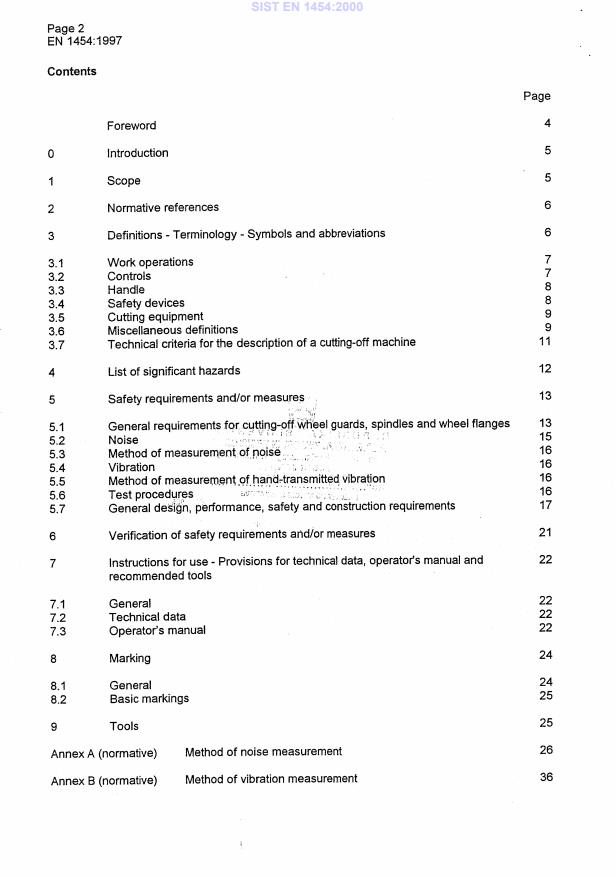 EN 1454:1997 is a standard published by the European Committee for Standardization (CEN). Its full title is "Portable, hand-held, internal combustion cutting-off machines - Safety". This standard covers: 1.1 This European Standard is applicable to machines which are designed for cutting -off mainly building construction materials but which could also be used for cutting metal according to the specific type of cutting-off wheel (...) selected. NOTE: For nominal dimensions and peripheral speed of cutting-off wheel see [clause] 5.7.1. This European Standard specifies design and construction requirements including safety, performance and testing for portable, hand-held internal combustion engine cutting-off machines (...). Additionally this European Standard specifies the information to be provided by the manufacturer on safe working practices. 1.2 This European Standard deals with all significant hazards pertinent to cutting-off machines when they are used as intended (see [clause] 3.12 of EN 292-1:1991) and under the conditions foreseen by the manufacturer (see clause 4). This European Standard specifies the appropriate technical measures to eliminate or reduce risks arising from the significant hazards. 1.3 This European Standard applies primarily to machines which are manufactured after the date of approval of the standard by CEN. [The scope of the complete standard includes a figure of a cutting machine.]