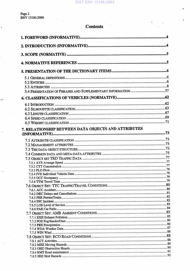 ENV 13106:2000 is a standardization document published by the European Committee for Standardization (CEN). Its full title is "Road transport and traffic telematics - DATEX traffic and travel data dictionary (version 3.1a)". This standard covers: This standard defines terms used for data and information in the fields of traffic and travel. The standard is applicable to traffic and transport engineering in general, and particularly data and information exchange. This ENV supersedes ENV 13106-1:1998. The normative terminology is provided in tables 1 to 3. Table 1 provides general definitions; it is normative. Table 2 lists the entities and their instances; it is normative. Table 3 lists the attributes with their definitions, values, units, data type, field width and default format.