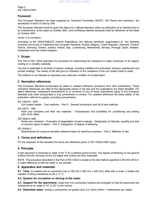 ScopeThis Part of EN 13523 describes the procedure for determining the resistance to water immersion of an organiccoating on a metallic substrate.The test is applicable to all kinds of organic coatings, including metallics and embossed, textured, pearlescent andprinted coatings. The results of the test give an indication of the resistance of the coil coated metal to water.The method is not intended to reproduce any particular condition of condensation.2