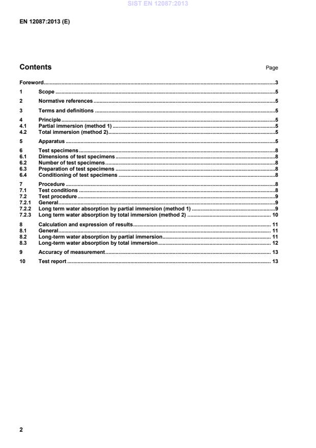 This European Standard specifies two options: Method 1 - partial immersion Method 2 - total immersion The long-term water absorption by partial immersion is intended to simulate the water absorption caused by long term water exposure. The long-term water absorption by total immersion is not directly related to the conditions on site, but has been recognised as a relevant condition of test for some products in some applications. 2 Normative references The following documents, in whole or in part, are normatively referenced in this document and are indispensable for its application. For dated references, only the edition cited applies. For undated references, the latest edition of the referenced document (including any amendments) applies. EN 12085, Thermal insulating products for building applications — Determination of linear dimensions of test specimens ISO 5725-2, Accuracy (trueness and precision) of measurement methods and results — Part 2: Basic method for the determination of repeatability and reproducibility of a standard measurement method 3 Terms and definitions This European Standard contains no terms and definitions. 4 Principle